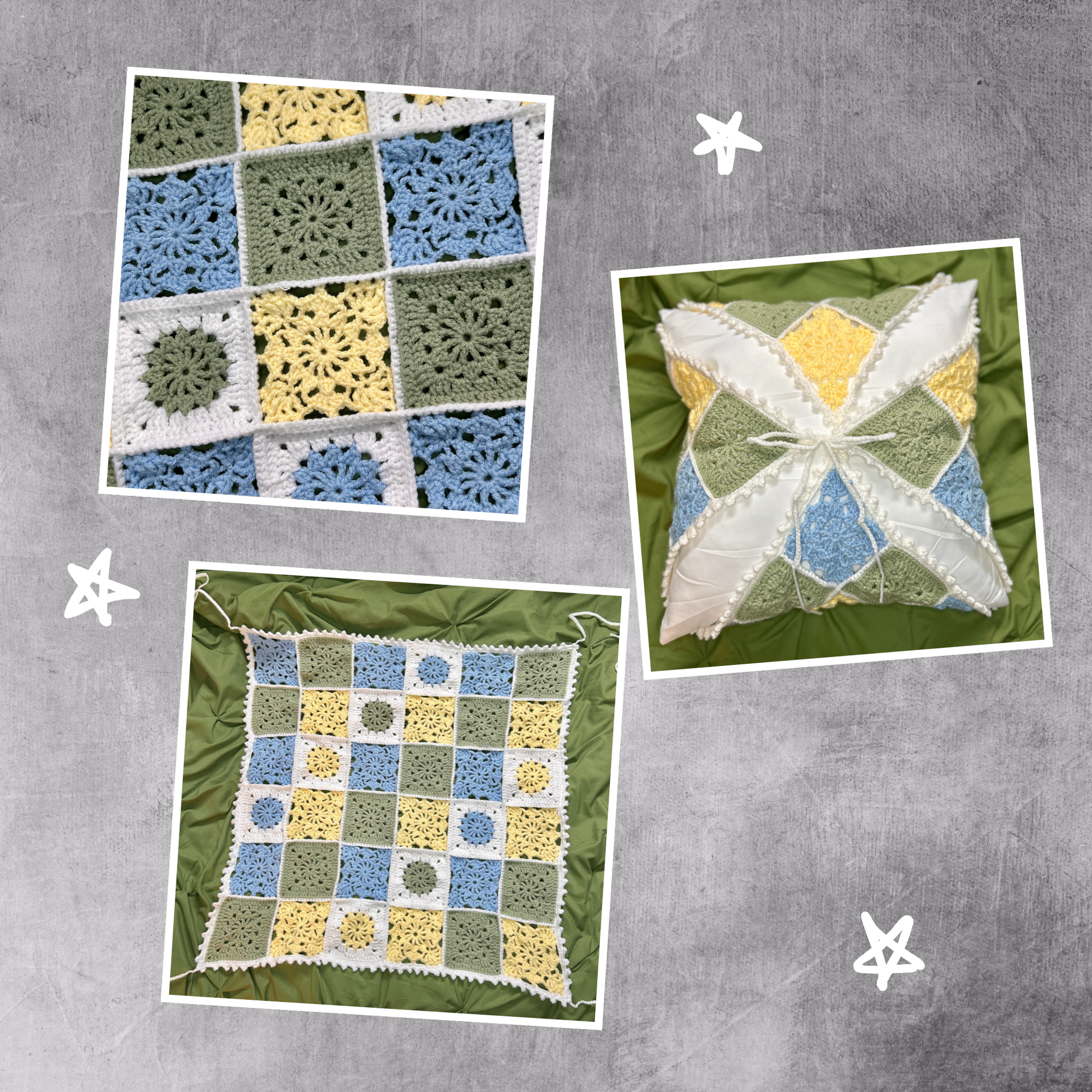 Bring summery cottagecore energy to your couch, chair, or bed. Featuring a patchwork of delicately crafted granny squares in soft sage, sky blue, buttery yellow, and crisp white, it’s basically sunshine and lemonade in pillow form.